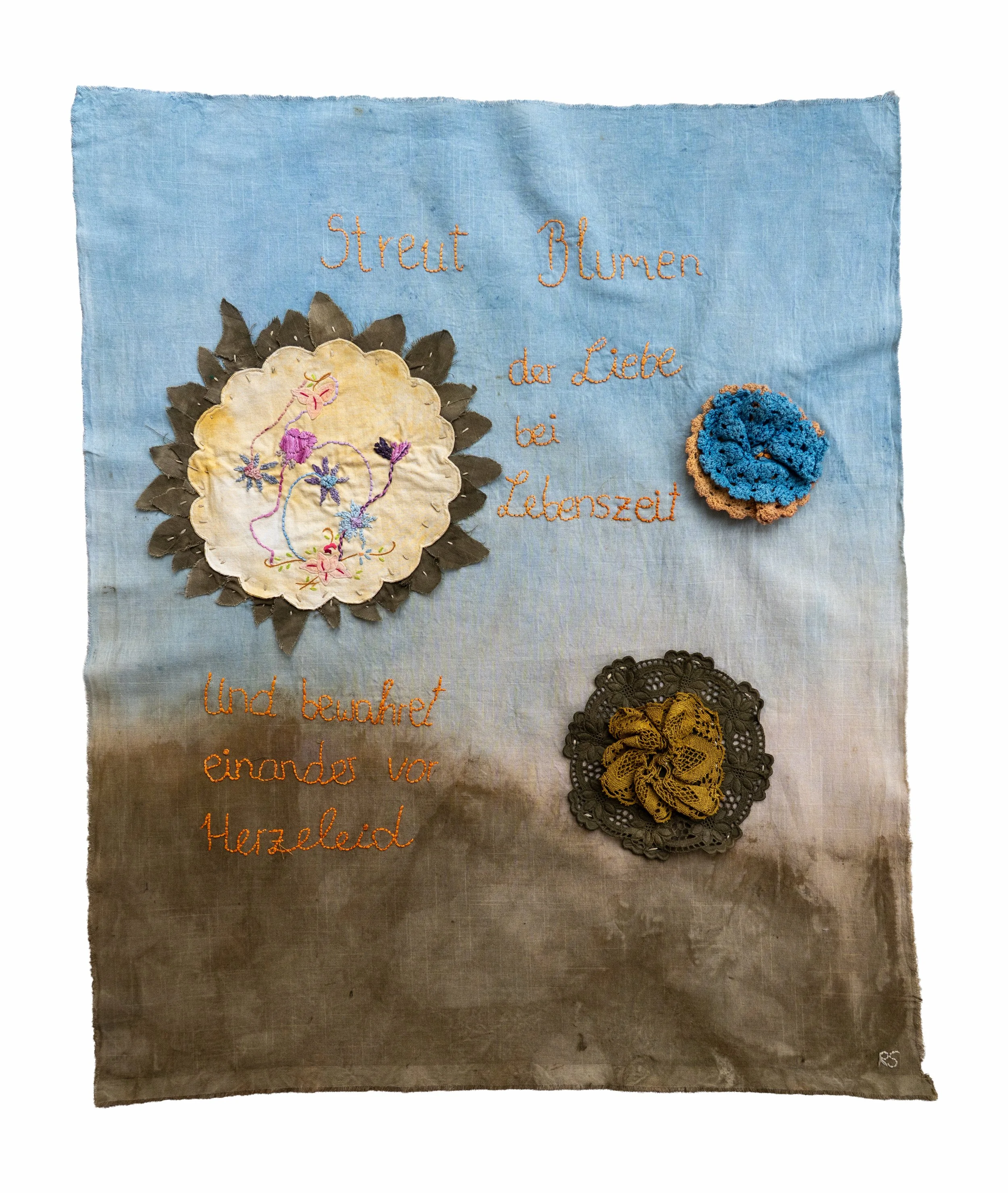 “Für Maria, Getraud und Elisabeth”, natural dyes and embroidery on cotton, 60x70 cm, 2026.